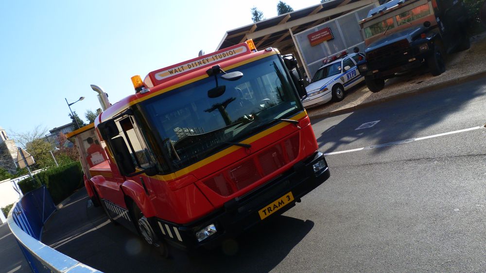 A partir de ce point, tout devient humide et brumeux, du moins pour les passagers assis du coté gauche au moment ? où sous d’impressionnants effets sonores, le conducteur du tram s’engage dans un plateau de tournage en plein air en forme de caverne désolée baptisée « catastrophe Canyon ». Sur ce plateau, un pétrolier explosant, soudainement la route se fissure et un véritable déluge d’eau déferle en direction du véhicule à bord duquel vous vous trouvez. Tout cela cause naturellement beaucoup de remue-ménage et plusieurs personnes se retrouvent mouillées. Vous aurez compris qu’il s’agit de simuler tout à la fois, un incendie, un orage, un tremblement de terre et une crue subite. Après cet émoi et une évacuation forcée par le chef de plateau, vous vous trouvez devant les différents types de façades. Tout y est : les façades du sud de la France, parisiennes et orientales,… même les murs de la tour de la terreur et les coraux du monde de Némo sont présents ! Il s’en suit toute une exposition de véhicules ayant servi aux tournages de films comme les 101 dalmatiens, Dinotopia et bien d’autres. Mais attention : Un petit intrus au nom de RC Racer se cache parmi eux.